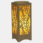 This 10" tall oil warmer adds style to any room. Features attractive cut-out flower design that gives a unique look when the light is on. Comes with removable oil dish and 30" power cord with built in on/off switch. Adjust the light to the desired brightness and intensity of the scented oil.Due to the lighting, the warmer appears beige, however, this warmer is white.