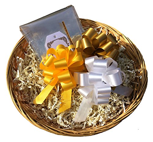 12" Empty Gift Basket, Easy Gift Wrap Kit, 8-Piece Set w/ Reusable Basket to Fill, Cellophane Bag, Paper Shred, Twist Tie, 3 Pull Bows, Gift Tag; Birthday, Christmas, Easter, Etc (Gold and White)