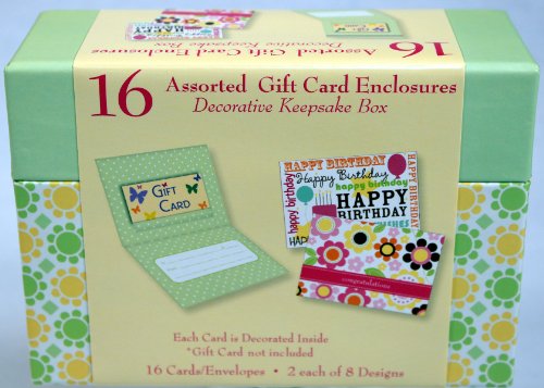 Personalize your gift card giving with these gift card enclosures that are decorated inside and out. Birthday, baby, congratulations and other occasions are included. Gift cards simply slide into the pre-cut slot. Great for the person on the go! Cards are strong, beautifully coated and measure 5.25" x 3.25". The cards come with 5.5" x 4" white envelopes and a nicely decorated 6" x 4.25" x 2.25" storage box. Use this in your home, office or as a perfect gift to a friend or family member!