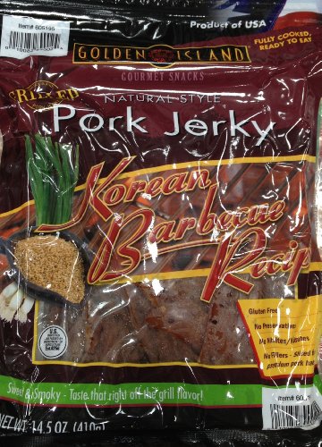 2 x 14.5oz Pork Jerky Korean Barbecue Recipe Gourmet Snack Golden Island. Brand new & sealed in factory packaging. Two (2) bags per order. Net weight 14.5oz per bag. Sweet & slightly smoky, you'll enjoy this jerky as much as the grilled pork from your favorite Korean inspired restaurant. With bold flavors of sesame and spices, this sweet and soft jerky will become one of your favorite snacks. Tastes like it just came off the grill! Sweet, tender and flavorful. Fully cooked, ready to eat. Product of USA.