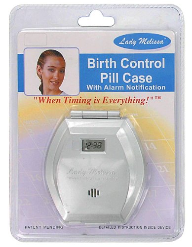 Birth control pill dispenser case with clock, date and alarm. The silver plastic case takes the place of the standard case of most ortho style pill dispensers. Battery included is a # LR44 cell type battery. Comes with detailed instructions for use and guarantee. Comes in clam shell packaging with UPC.