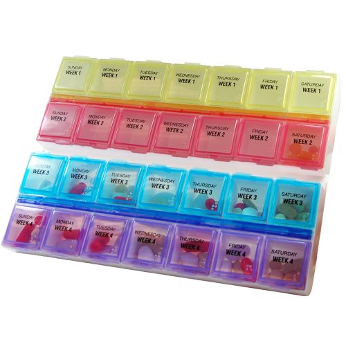 Allows Medication to be scheduled corresponding to the week of the month Organize all your medications for an entire month at one time. Convenient, time saving unit ends confusion of which pills to take throughout the day. Ideal for home or travel with large wells and easy to read labeling for each day. Plastic Approx. Dimensions: 8" L X 6" W X 1.5" D Each compartmetn is about 1x1x1 organizer is top rack dishwasher safe Each compartment holds 25 aspirin tablets. 1 compartment per day format for 4 weeks/28 Days Labeled "Sunday Week1", "Monday Week1", "Tuesday Week 1" etc. for 4 weeks. Braille markings included. Entire lid pops off for cleaning. Reviews