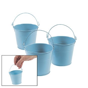 Create the most unique goody baskets with these fun Blue Tin Pails. To make these pails more unique, have each guest decorate their own pail 1 Dozen Pails Measures: 3 Inches Tall Blue Metal in Color. Not food safe, use wrapped candy only.