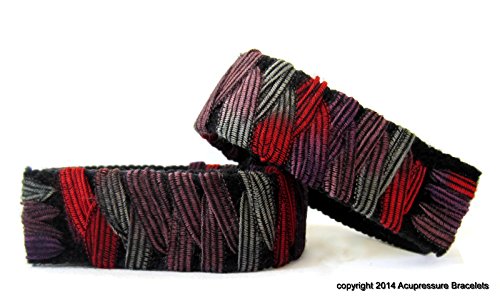 Black cotton stretch fabric band with purple, red, grey trim. Bracelets are the stylish alternative to the average acupressure anti nausea wristbands.