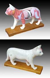 This model shows 36 useful acupuncture points on left side of the cat body marked with numerals. Made of PVC plastic. Used for veterinarian reference.