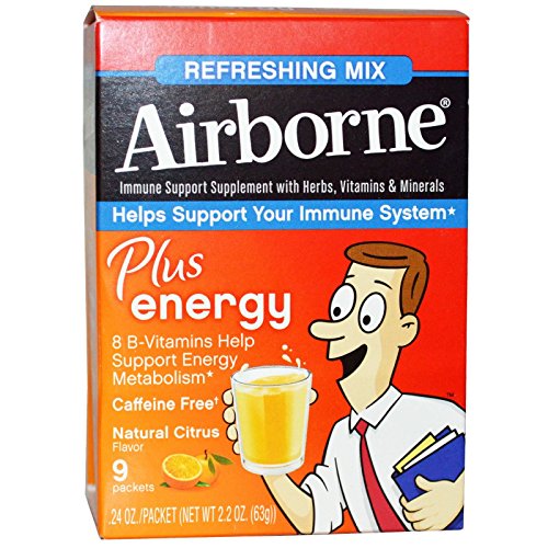 In addition to providing immune support, caffeine-free Airborne Plus Energy delivers B-vitamins that help your body convert food into energy. Airborne features a unique combination of vitamins, minerals, and herbs. Contains eight B-vitamins that help your body convert food into energy*. View larger. B-Vitamins Convert Food into Energy Eight B-vitamins have been added to Airbornes formula of vitamins and minerals. These work with your body to help convert food into energy, without caffeine. Airborne Plus Energy gives you concentrations of B-vitamins without the jittery side effects of caffeinated drinks. Vitamins, Minerals, and Herbal Extracts Provide Immune Support The key ingredients in Airborne Plus Energy support immune health. The blend of herbs works together with carefully selected vitamins and minerals to help support your immune system.* Regular exercise, a balanced diet, and plenty of sleep are essential to good health.