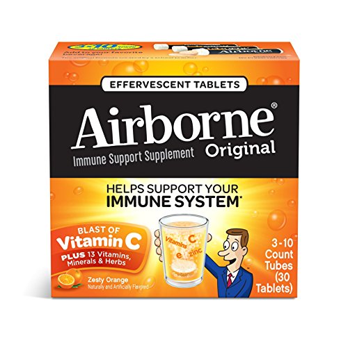 Airborne Immune Support Supplement with Vitamin C, Effervescent Tablets, Zesty Orange Flavor, 10 Count (pack of 3).