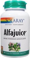 Alfajuice 550mg by Solaray 180 Capsule Alfalfa juice powdered concentrate is a 100 natural source of a wide range of nutrients. Each capsule typically supplies 550mg of powdered alfalfa juice equivalent to approximately 4400 mg fresh alfalfa juice or 62 000 mg fresh alfalfa. Size 180ct 550mg Directions As a dietary supplement take 2-6 capsules daily. Serving Size 6 Capsule 30 Servings per container Ingredients Amount per serving Daily Value + Protein 2 g 5 Total Carbohydrates 1g 1 Calories 15 Xanthophyll (from Alfalfa Juice) 3.3 mg Powdered Alfalfa Juice (from Alfalfa Juice) 3300 mg Cellulose (from Alfalfa Juice) 53 mg Choline (from Alfalfa Juice) 6 mg Chlorophyll (from Alfalfa Juice) 8.3 mg Calcium (from Alfalfa Juice) 96 mg 9.60 Phosphorous (from Alfalfa Juice) 31 mg 3 Magnesium (from Alfalfa Juice) 4 mg 1 Vitamin A (as Beta Carotene) (from Alfalfa Juice) 1152 IU 23 Manganese (from Alfalfa Juice) 290 mcg 15 Iron (from Alfalfa Juice) 2 mg 11 Vitamin K (as Phylloquinone) (from Alfalfa
