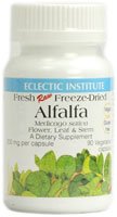 Alfalfa Fresh Freeze-Dried by Eclectic Institute 90 VegCap Alfalfa Fresh Freeze-Dried (Medicago Sativa) Flower Leaf Stem 200 mg per capsule 100 Kosher 100 Fresh Freeze-Dried Ingredients Fresh freeze-drying maintains the biologically active constitutens for highstes potency and action. Each capsule contains ORGANIC Alfalfa (Medicago Sativa) flower leaf and steam. 200mg Suggested Use Take 1-3 capsules per day. Discontinue use if unusual symptoms occur. Consult your health care advisor regarding the use of herbs during pregnancy with infants or with prescription drugs. Keep out of reach of children.