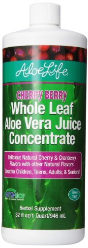 The cherry berry whole leaf aloe vera juice concentrate is the highest quality aloe vera in a bottle providing maximum benefits when taken daily, with 7 percent natural fruit juice concentrate added no sugar. Benefits include help with digestion and abs option when taken before meals, energy, immune system support, anti inflammatory support for the tissues and joints, allergies, liver support, bowel distress, skin.