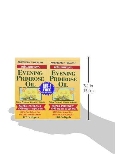 Evening Primrose Oil 1300mg Royal Brittany Twin Pack by American Health Products 120+120 Softgel Evening Primrose Oil 1300mg Royal Brittany Twin Pack 120 120 Softgel Product For centuries women of all ages have depended on the reliability of Evening Primrose Oil. EPO is a source of Gamma-Linolenic Acid GLA -117 mg per serving a fatty acid not made in large quantities by the body and not commonly found in food. Popular with women of all ages EPO helps provide nutritional support for women with PMS. Royal Brittany EPO is one of the best products of its kind on the market. The EPO used for Royal Brittany is cold-processed and is void of Hexane and all other solvent residue. Royal Brittany EPO assures quality reliability and purity. Helps Promote Womens Health Provides Nutritional Support for Women with PMS 1300 mg 117 mg GLA 9 100 Pure Cold-Pressed Solvent Free Potency Guaranteed by Assay Suggested Use As a dietary supplement adults take one (1) softgel three times daily preferably with