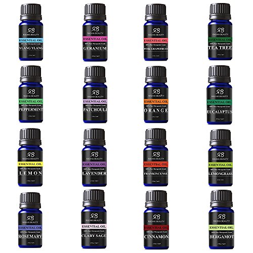 top 16 essential oil set - Lavender, tea tree, peppermint, lemongrass, orange, eucalyptus, rosemary, frankincense, lemon, bergamot, ylang ylang, patchouli, geranium, pink grapefruit, cinnamon, clary sage