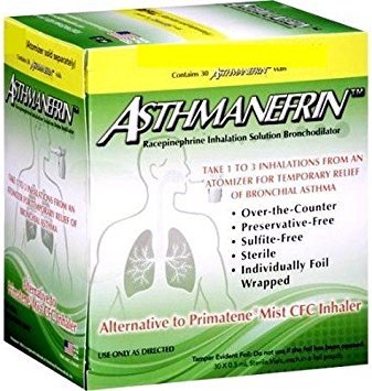 AsthmanefrinTM is an over-the-counter medication for the temporary relief of bronchial asthma, including shortness of breath, tightness of chest and wheezing. AsthmanefrinTM can be administered for patients ages four (4) and older. AsthmanefrinTM is an inhaled solution delivered to the patient via a handheld device known as an atomizer. This product is not a CFC inhaler, and presents no risk to the environment. AsthmanefrinTM has been used to treat asthma in children and adults for over a hundred years. When removed from the pouch, an unopened vial is in good condition for a maximum of seven (7) days. If the product is kept in the pouch, even if the pouch has been opened, it will last until the expiration date. Plastic vials are recyclable