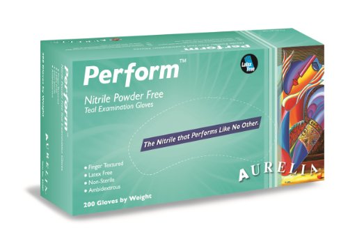 The Aurelia Perform 9239 nitrile, powder-free, disposable glove is green for high visibility and is manufactured in an FDA-inspected and ISO 9002 registered facility, and meets U.S. Department of Agriculture (USDA) federal regulations for use in food processing and handling. The glove has a palm thickness of 2.6 mils and a finger thickness of 3.6 mils and is 9.5" long from the tip of the middle finger to the edge of the beaded wrist cuff, which is 2 mils thick. Nitrile provides better elasticity than vinyl, better puncture resistance than latex or vinyl, better abrasion resistance than chloroprene, and reduces the likelihood of allergic reaction. This ambidextrous green glove is suitable for dental and medical examination applications