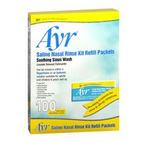 The all natural way to irrigate the sinuses, the Ayr Saline Nasal Rinse Kit flushes allergens and contaminants from the nasal passages to cleanse the sinus cavity and help prevent infection. The Ayr Saline Nasal Rinse Kit helps relieve congestion and symptoms associated with chronic sinusitis, allergic and non-allergic rhinitis, the common cold, and the flu. Each kit contains a dishwasher-safe squeeze bottle, pre-measured salt packets, and an easy-to-read illustrated instruction booklet with directions in both English and Spanish. Ayr helps you breathe better.