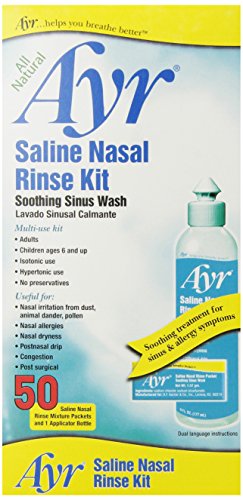The all natural way to irrigate the sinuses, the Ayr Saline Nasal Rinse Kit flushes allergens and contaminants from the nasal passages to cleanse the sinus cavity and help prevent infection. The Ayr Saline Nasal Rinse Kit helps relieve congestion and symptoms associated with chronic sinusitis, allergic and non-allergic rhinitis, the common cold, and the flu. Each kit contains a dishwasher-safe squeeze bottle, pre-measured salt packets, and an easy-to-read illustrated instruction booklet with directions in both English and Spanish. Ayr helps you breathe better.