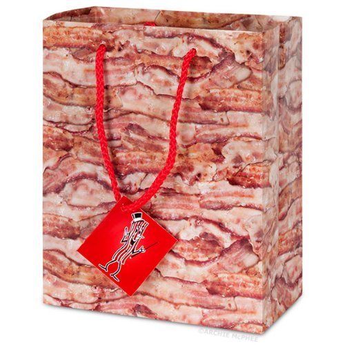 This 7-1/2" x 4" x 9-1/2" (19.1 cm x 10.2 cm x 24.1 cm) paper gift bag is decorated with beautiful bacon. While this is the perfect thing to hold a gift for any bacon lover, there better be something pork related inside or they will be severely disappointed. Includes thick string handle and attached gift card.
