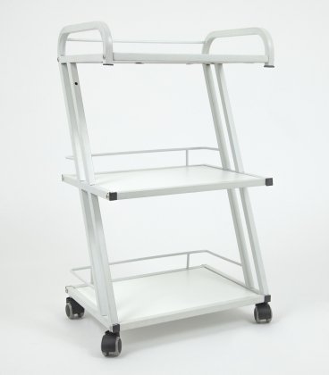 Slanted yet stable 3 Level Wooden Trolley which can stand up to 50Lb of weight per shelf. Also, note that each level has its own metal guard around the back side of the unit to prevent valuable products and instruments to fall of the end while being moved around your facility. Ultra white frame finish and rollers.BOX