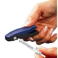 For needle disposal. Safely clips and stores up to a two-year supply of insulin syringe needles. Simple clipping action snips off and retains needles within clipper. Meets government regulations on proper method of in-home insulin syringe disposal. Compact and portable. Locks closed for travel and storage.