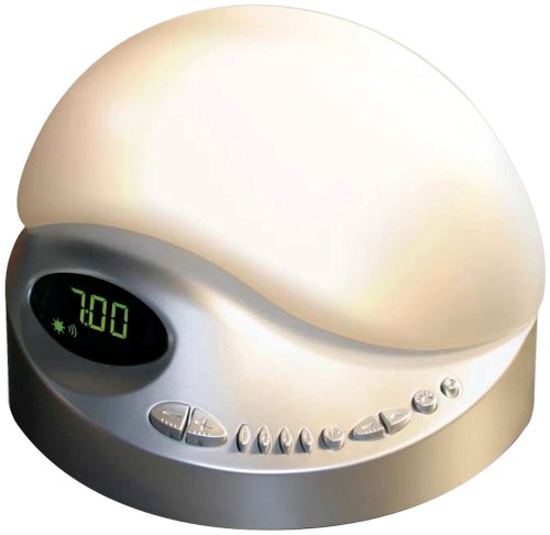 BioBrite�s newest product, the SunRise Clock Radio is derived from medical research on light and human behavior. In the early morning, the human biological clock is sensitive to low intensity light. So, waking to a slowly increasing light can result in a smoother, more natural transition to wakefulness. While gently waking with a simulated sunrise, now you can let the 6:52 weather report on the FM radio inform you of a sunny day before you even open your eyes. If you�d like to fall asleep with music playing the background, you can program the radio to fade out after a period of time which you can adjust. Other features include the choice of fade up and fade down over 15, 30, 45, or 60 minutes; snooze feature; the security feature of random evening lighting; fade to nightlight; a back up audible alarm; your choice of 12 or 24 hour time read-outs; hand made opal glass globe; snooze feature; power failure backup. Also displays the date up to Thursday, December 31, 2099. One year manufacturer�s warranty.