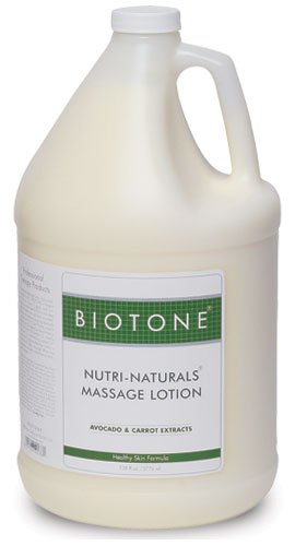 Biotone Nutri-Naturals Massage Lotion combines skin healthy, vitamin rich ingredients to create a silky, emollient lotion that goes beyond basic moisturizing. Easy to apply and non-greasy, it provides gentle friction, and the ideal glide, that leaves skin smooth and nourished. Blended with deep-moisturizing Avocado Oil, vitamin fortified Carrot Oil (Beta Carotene/Vitamin A), Wheat Germ Oil (Vitamin E), Vitamin C, healthy Sunflower Oil, and healing Jojoba Oil. Perfect for full body massage. May also be used daily as a skin care moisturizing lotion. Light garden-fresh scent. Gal.