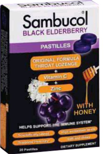 Featuring the immune-supporting properties of elderberry, vitamin C and zinc as well as honey, Sambucol(R) Black Elderberry Pastilles are perfect for continuous immune system support. By using a proprietary method of extraction, only Sambucol can guarantee consistent, immune-supporting properties in every serving. This formula is free from lactose, gluten, yeast, egg, artificial flavors and colors. Suitable for vegetarians.