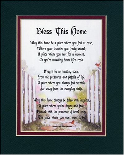 This beautiful, heart-stirring verse was created by nationally recognized poet, Genie Graveline. This quality product is 8 x 10 in size. It is double matted. The Verse is...... Bless This Home...... May this home be a place where you feel at ease, ...... Where your troubles you freely unload, ...... A place where you rest for a moment, ...... As you're traveling down life's road. ...... May it be an inviting oasis, ...... From the pressures and pitfalls of life, ...... A place where you always feel wanted, ...... Far away from the everyday strife. ...... May this home always be filled with laughter, ...... A place where you're happy and free, ...... Blessed with the presence of loved ones, ...... The place where you most want to be! ......