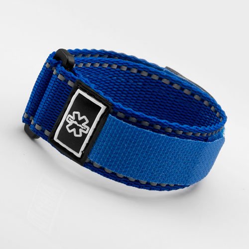 This blue nylon sport strap, adjustable to fit 5 1/2 to 8 inch sized wrists, displays a prominent medical symbol in white and can be tightly secured by hook & loop fastener. You can slide an ID tag with medical or emergency contact information onto a small band located next to the medical symbol. This particular strap design is intended for the active child who enjoys running, biking, skiing, or participating in many other athletic activities.