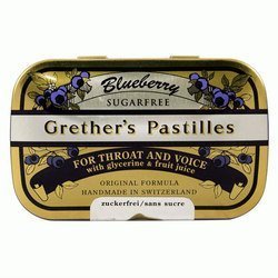 Blueberry is the latest refreshing flavor that Grether`s has to offer! The naturally pure juices of fresh blueberries lend these traditional pastilles their stunning color and unforgettable fruity aroma. Classic sugar free pastilles in the golden tin were invented around 300 years ago and today they are still being manufactured by hand in Switzerland according to an old English formula. Recommended for hoarseness, sore throats, raspy voice and dry mouth.