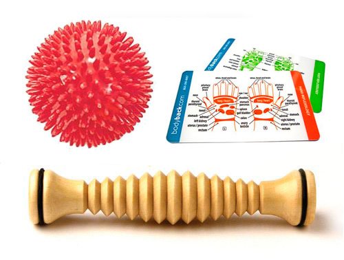 The Foot Roller Massager activates pressure points releasing healing energy to regenerate the feet and benefit the whole body. Did you know that the feet have the highest concentration of nerve endings in the body? The Foot Roller Massager activates pressure points releasing healing energy to regenerate the feet and benefit the whole body. The Foot Roller massages and soothes sore and tired feet, stimulates circulation and makes the entire body feel good. Made of natural wood. The porcupine ball has hundreds of sensory nodules. When when rolled along the body they provide a kneading effect resulting in deep muscle release and increased blood flow to the affected area to promote healing. Keep one at home, another at work and another in your gym bag. Easy and fun to use on yourself or a partner. The Large Foot Roller is 8 inches long, and the Large Porcupine Massage Ball is 2.75" inches in diameter (8 cm). (Comes with one free reflexology card! - Image shows front and back)