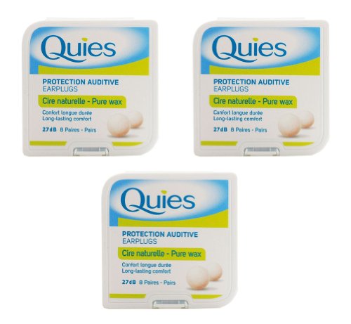 Disposable protective earplugs made of natural wax. Good for air travel and swimming. Each Box contains 16 Earplugs (8 Pairs). You will receive 3 Boxes. Made of natural wax. Quies - Protections auditives - Cire Naturelle - Imported from France. Hypoallergenic. Comfortable and effective protection against the potentially harmful effects of noise; excellent noise reduction properties. Disposable for maximum protection. Boules Quies Ear Plugs are made from a combination of natural waxes and cotton: the soft flexible material is designed to fit the ear naturally, easily and securely. Hypoallergenic and non-irritating to the sensitive skin in the ear canal, these now legendary earplugs offer maximum protection and comfort.