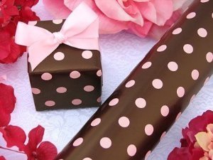 Whether you're looking to wrap sweet 16 gifts, birthday presents, or wedding favors in this stylish, beautifully colored gift wrapping paper, create beautiful centerpiece boxes, or use with your party or wedding invitations or table decorations, this lovely brown with pink polka dots gift wrapping paper is ideal to add splashes of color to your party or wedding favors, table decorations, and more.