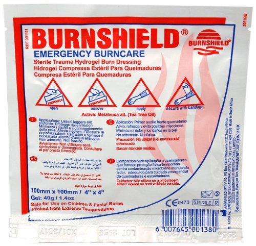 Suitable For: Small area Burns, First Aid Kits, Fingers, and Children. Absorbs and dissipates heat Non-toxic Reduces pain and secondary contamination Minimizes shock and skin damage Non-irritant BURNSHIELD, when applied to burn wounds-preferably as soon as possible after the burn-has the tremendous ability to absorb and dissipate heat, providing relief, minimizing shock and skin damage, halting the burn process, and physically protects against further contamination. BURNSHIELD's cooling and soothing effect results from its specially formulated Hydrogel which is non-toxic and non-irritant. The active ingredient is Melaleuca alternifolia. BURNSHIELD facilitates removal of burnt clothing. Easy to apply, non-adhesive and easy to remove without further trauma to the patient, allowing for quick medical diagnosis. Safe for use on children. BURNSHIELD can be used as an emergency care for superficial to full thickness burns. Any burn, whether received from open flames, scalding from hot water, steam, gas, chemicals or electrical appliances can be treated immediately with BURNSHIELD.