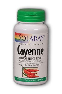 Cayenne 450mg by Solaray 100 Capsule Cayenne is a very hot pepper known for its ability to support normal healthy blood circulation. Size 100ct 450mg Directions As a dietary supplement take 1 capsule two times a day with meals or a glass of water. Serving Size 1 Capsule 100 Servings per container Ingredients Amount per serving Daily Value + Cayenne (Capsicum annuum)(pepper) 450 mg Key to Ingredients Daily Value not established. + Percent Daily Value is based on a 2 000 calorie diet. Values differ depending on age Values differ depending on age Other Ingredients Gelatin (capsule) and magnesium stearate Other See product label for more information.