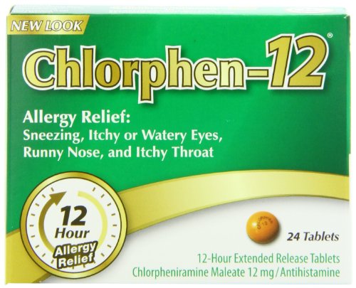 Chlorpheniramine Maleate 12 mg Extended Release Tablets, generic equivalent to Chlor-Trimeton 12 Hour Tablets. Temporarily relieves the following symptoms due to hay fever or other upper respiratory allergies: sneezing, runny nose, itchy, watery eyes, itching of the nose or throat. Anithistamine.