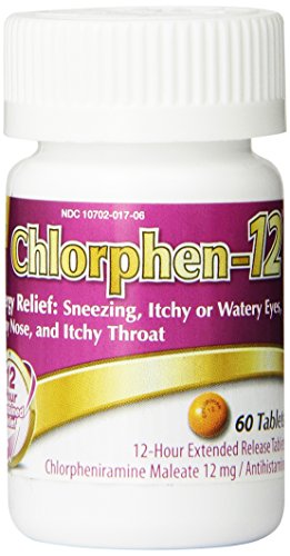 Chlorpheniramine Maleate 12 mg Extended Release Tablets, generic equivalent to Chlor-Trimeton 12 Hour Tablets. Temporarily relieves the following symptoms due to hay fever or other upper respiratory allergies: sneezing, runny nose, itchy, watery eyes, itching of the nose or throat. Anithistamine.