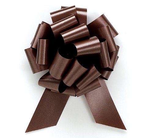 Large 5 inch diameter bow (20 loops per bow) made of 1 -1/4 inch wide fabric embossed poly floral waterproof ribbon. Simply snip off a length of assembled ribbon and pull on the thin inner ribbon, and the bow pulls up like magic. Tie off and the bow and attach with the remaining two pull ribbons. These bows come in handy-to-dispense rolls that are easier to use than the individually wrapped bows (the wrapped bows are folded and tend to catch when pulled).