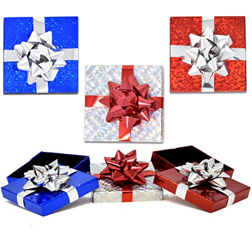 Gift Boutique Christmas Holiday Money & Gift Card Holder Boxes Set of 6. Christmas gift card holders come in 3 assorted colors red, blue and silver! Get 2 of each color. Unique present box design with attached bow! Great to have handy during the Holiday season! Measures: 4.25"x 4.25" x 1". Great for monetary gifts or gift certificates or for holiday tips for service professionals. Features gift card slot that can also hold cash when it's folded in half.
