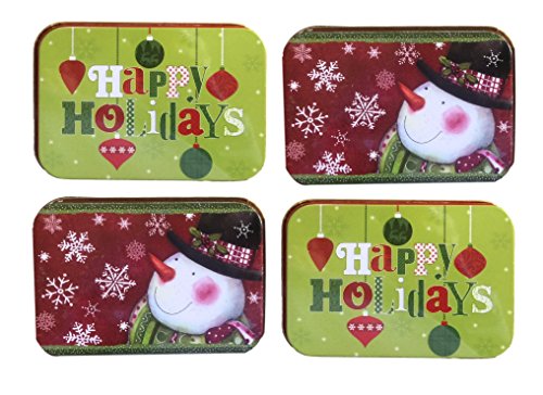 4 Pack of Christmas Gift Card Holders - 2 Snowman, 2 Happy Holidays. Each tin box is felt lined with a place to secure gift card. Each gift card holder measures 4 1/4 x 2 3/4" Perfect holiday gift for families, friends, and employees