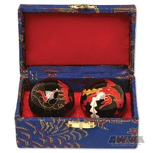 Otherwise known as mystic Chinese chiming balls, these cloisonne balls have a simple highly polished design. Crafted to be perfectly balanced so they are easier to manipulate and less difficult to hold. Great for training or relaxing, the musical chime within the cloisonne balls helps to increases blood circulation in the hands. Comes with a brocaded, felt lined satin snap storage box. A good stress reliever.