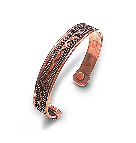 This bracelet is made of pure Copper with tiny magnets attached on both its edges. Since Roman Times, COPPER and MAGNETS are believed to be instrumental in affording relief to ARTHRITIS & RHEUMATIC conditions. Regular use of any metal polish will enhance the natural luster of Pure Copper.