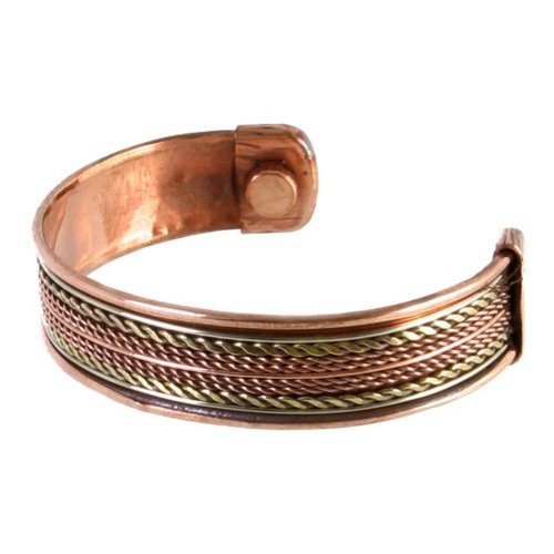Attractive copper magnetic bracelet, suitable as an aid for relief of joint pain, arthritis, carpal tunnel, wrist injuries or just to look nice! This ethnic style copper bangle is hand made and features gold and silver coloured intricate detailing that will suit most men regardless of age. Contains 2 high strength therapeutic magnets close to the wrist joint.Magnetic jewellery, such as copper bracelets, are believed to improve blood flow to joints and injured areas of the body. This can help to restore electromagnetic balance, promoting healing and well being. Ideal for sufferers of both OsteoArthritis and Rheumatoid Arthritis as well as Joint Injuries,Tendonitis or Carpal Tunnel Syndrome. This sturdy men's bracelet can also can be worn to help prevent joint problems in people susceptible to joint pain or arthritis. It is great for men who use computer's daily, play sports such as golf or tennis regularly, are active gardeners or involved in other activities which put strain on the wrist joints such as carpentry or house maintenance.LIMITED STOCK SO BUY NOW TO AVOID DISAPPOINTMENT!