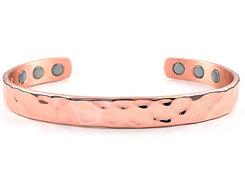This copper magnetic therapy bracelet is made & sold only by Magnet Jewelry Store. Our Copper Hammer bracelet is a finely crafted solid copper high power magnetic therapy bracelet. It has 6 permanent and powerful 3000 gauss rare earth magnets. This nickel free bracelet is about 1/3" wide and in the small size can be adjusted to fit wrists from about 6.5" to 7". This bracelet has a size stamp on the underside that indicates the size of the bracelet. Real copper, which this bracelet is made of, can naturally react to the environment & some people's perspiration to turn skin and copper, green, blue or black. This patina is natural and not a defect, and may happen because of the nature of real copper. This copper bracelet has an MJS stamp on the underside to verify this is an authentic Magnet Jewelry Store bracelet. We also include our Magnet Jewelry Store product information sheet and customer service logo card, which includes our toll free customer service phone number. You should not use magnets if you have an electronic implanted medical device, or if you are pregnant, and should consult a doctor before use. We make no claims for cure, treatment or mitigation of any physical condition. Thank you.