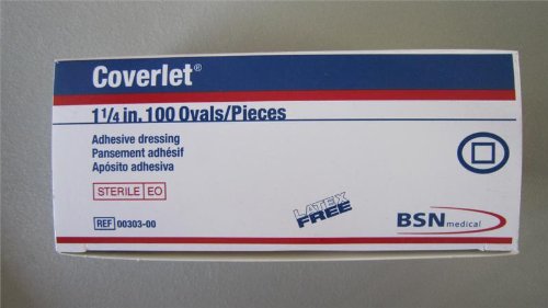 Coverlet Adhesive Dressing - 1 1/4" x 1" Coverlet Adhesive Dressing bandages and packaging are now 100%% latex-free, to safeguard you and your patients against latex reaction. Coverlet Adhesive Dressing is a simple peel-open package that makes it easy to apply while wearing gloves. Coverlet Adhesive Dressing has 360 adhesive coverage around the island wound pad that seals off the wound from dirt and contamination. The adhesive mass of Coverlet Adhesive Dressing provides firm and even adherence, preventing premature lifting of the dressing. The ease of removal limits skin irritation and disruption of the healing process. Coverlet Adhesive Dressing conforms to body curves and movement to stay on longer. Coverlet Adhesive Dressing offers mild compression to the wound.