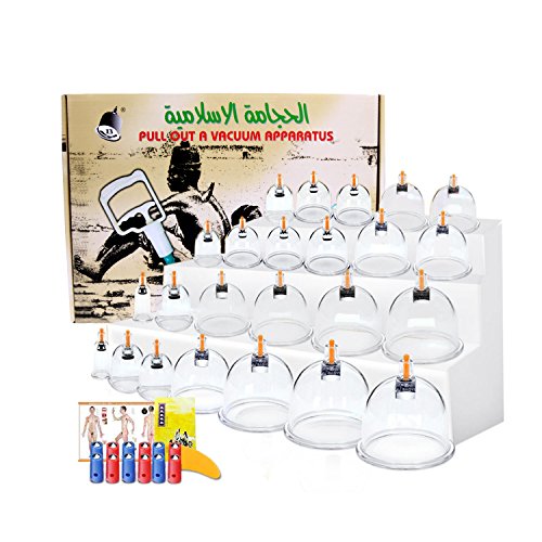 - CUPPING THERAPY SETS INCLUDES: 12 cups OD 2.75 inches , 6 cups OD 2.36 inches, 2 cups OD 2.05 inches, 4 cups OD1.73 inches. 12 magnetic needles, one large suction gun (25-inch long extension tube), English manual.