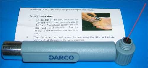 The MonoTempTM is a diagnostic tool that checks for distal symmetric polyneuropathy that utilizes both thermal and pressure testing. The alloy tip produces a cool sensation while the polymer tip remains neutral. The polymer tip unscrews to reveal a monofilament.