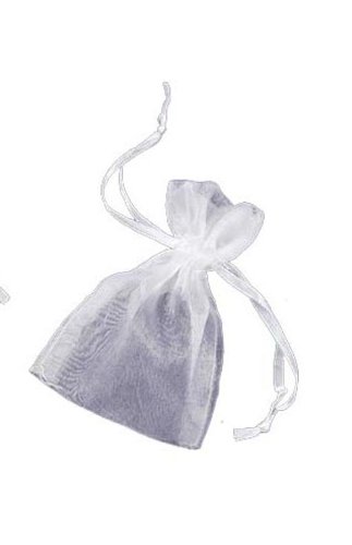 Shimmering white organza bags can be filled with nuts, candy, glittery coins and more and given as wedding favors. Fill with rice and give to guests for after the wedding ceremony. Easy to decorate with tiny florals or charms, too. Bag gathers at top with narrow white satin bow. 36 pieces per package. 3-inch by 4-inch bag with ribbon drawstring (7.62 by 10.2 centimeters).