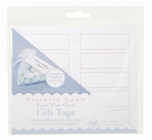 This printable gift tags make it easy to customize your wedding or party favors. Compatible with most home or office printers. Feature print your own gift tags and personalize them with the bride and groom's names and wedding date. Punch out the tiny, perforated hole at the top of the round tag and insert your own ribbon, yard or string through the hole to attach it to your wedding favor bags. This package contains 80 square tags. Available in white and silver color. Measures 3-inch length by 1-inch width.