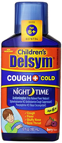 Children's Delsym cough plus cold night time relief. Acetaminophen (pain reliever / fever reducer), dextromethorphan HBR (cough suppressant), guaifenesin (expectorant), phenylephrine HCL (nasal decongestant).