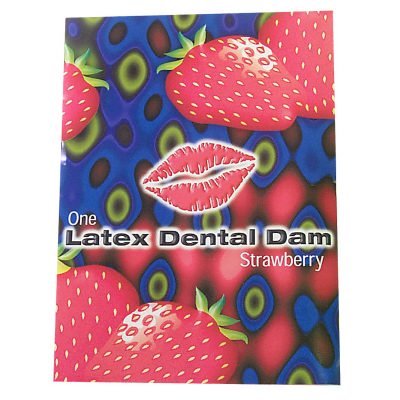 Dental Dam Strawberry Condom T6020. Trustex the name you have come to trust for birth control and disease prevention with their reliable latex condoms now make fun flavored dental dams. Latex Dental Dams Oral Sex Condoms by Line One Laboratories Inc. Safe and satisfying! The Latex Dental Dam is made for helping reduce the risk of getting a STD. For the ultimate protection for oral-genital contact during sex, Dental Dams are the best choice. Dental Dams are used to help reduce the risk of sexually transmitted diseases during oral sex by acting as a barrier to vaginal and anal secretions that may contain bacteria and viruses. They're very thin, yet reliable and strong, so your partner gets the most stimulation while you both remain highly protected. Dental Dams come in a variety of delicious flavors which you know will taste great because they are made by the same company that makes Trustex flavored condoms. The dental dam is flavored to make the encounter more enjoyable. Simply place the dam over the place of oral encounter and have great time! Scented Latex Dental Dams are a 6 inches by 8 inches sheet of latex rubber scented in 5 delicious flavors. Flavors to choose from: Banana Latex Dental Dam, Grape Latex Dental Dam, Mint Latex Dental Dam, Mint Latex Dental Dam and Strawberry Latex Dental Dam. Easy to use: simply place the dam over the place of oral encounter and have great time!